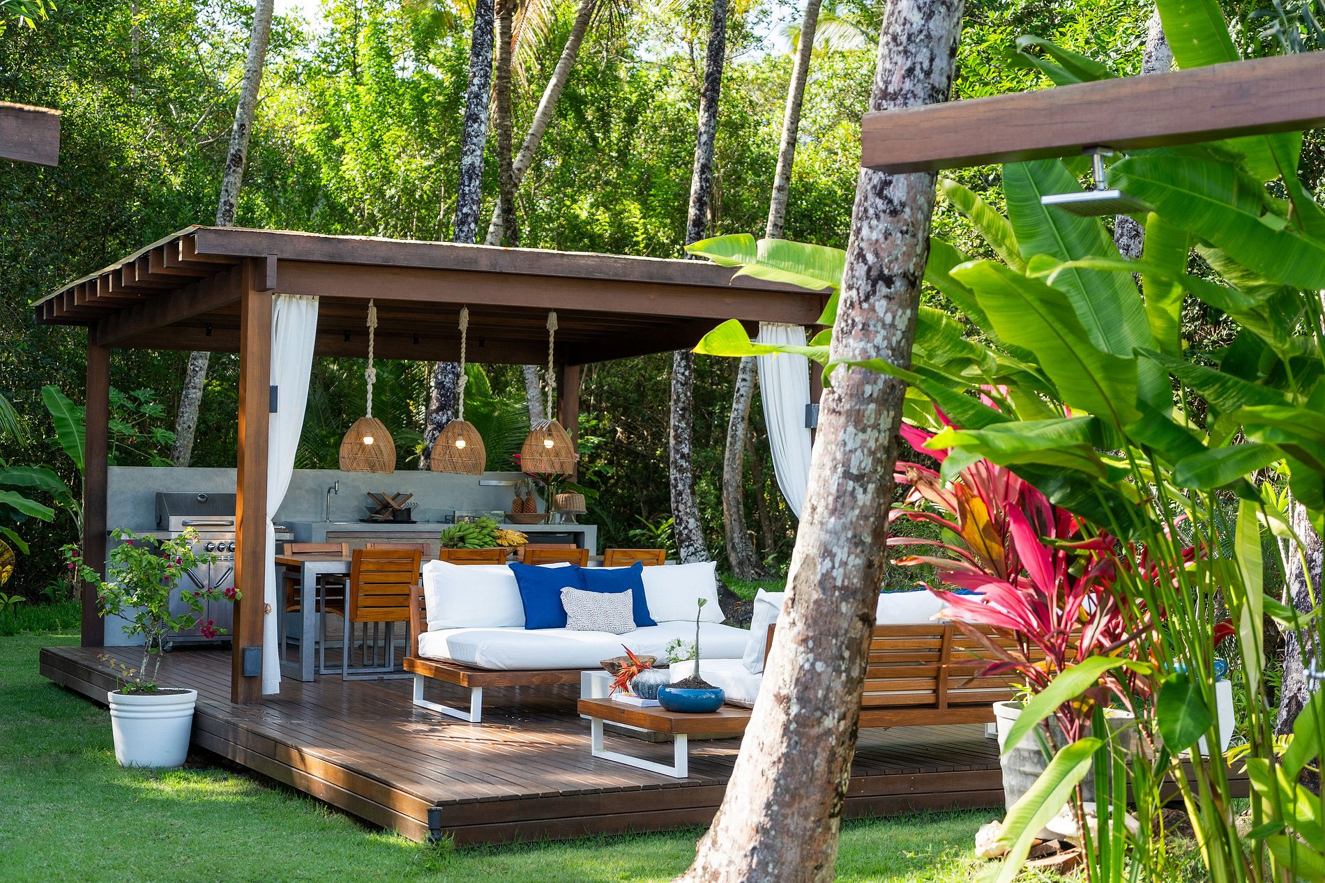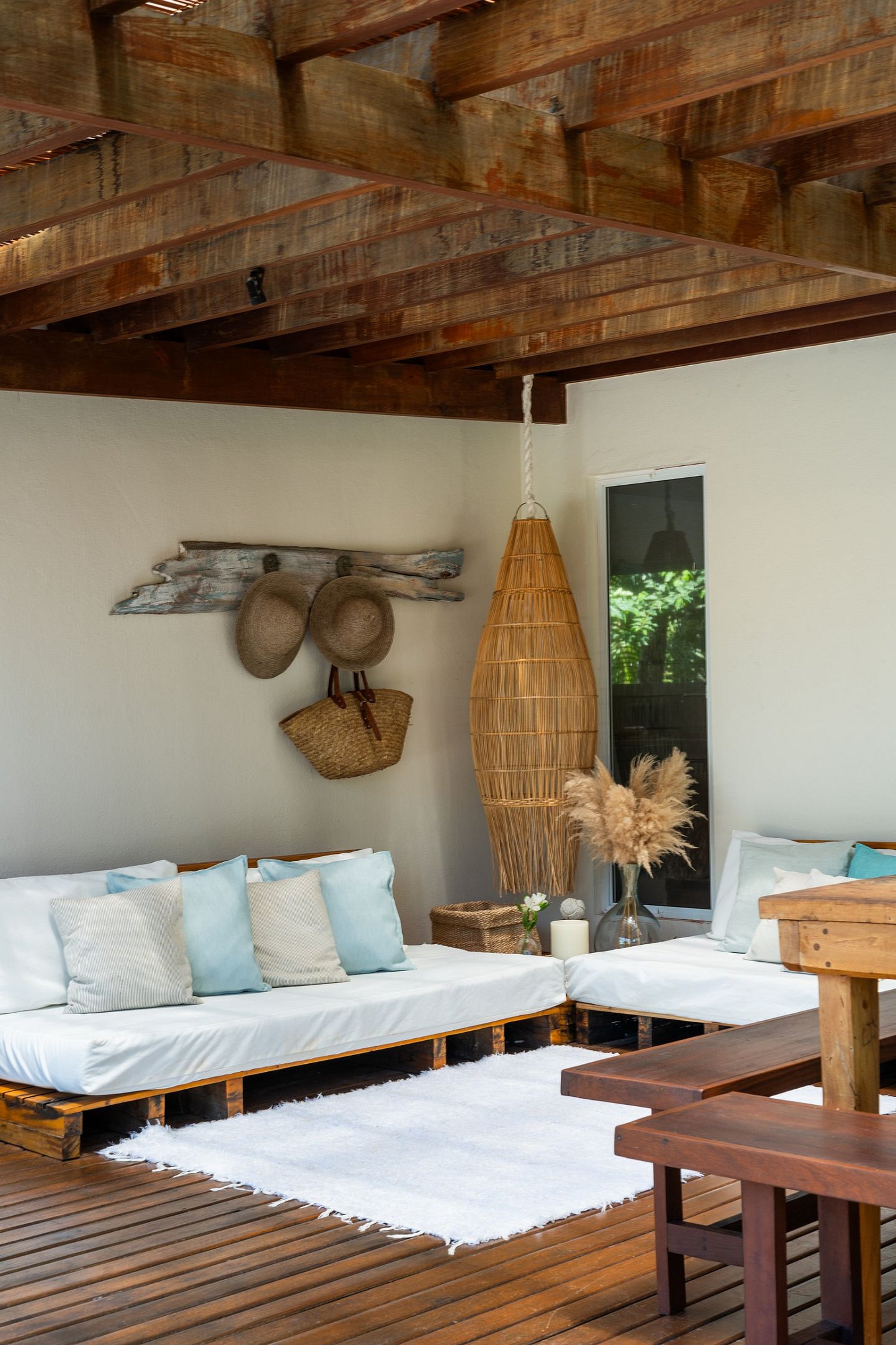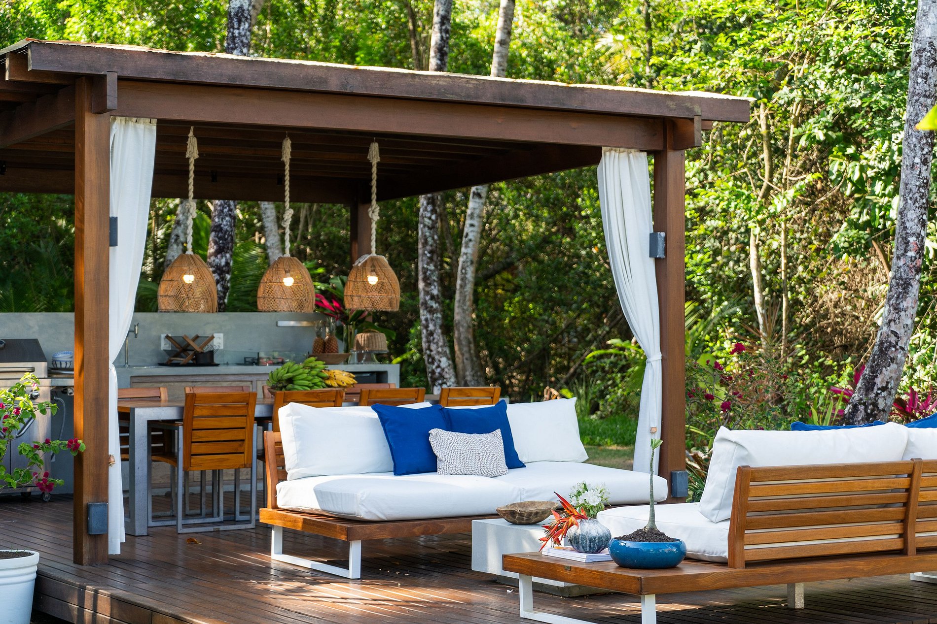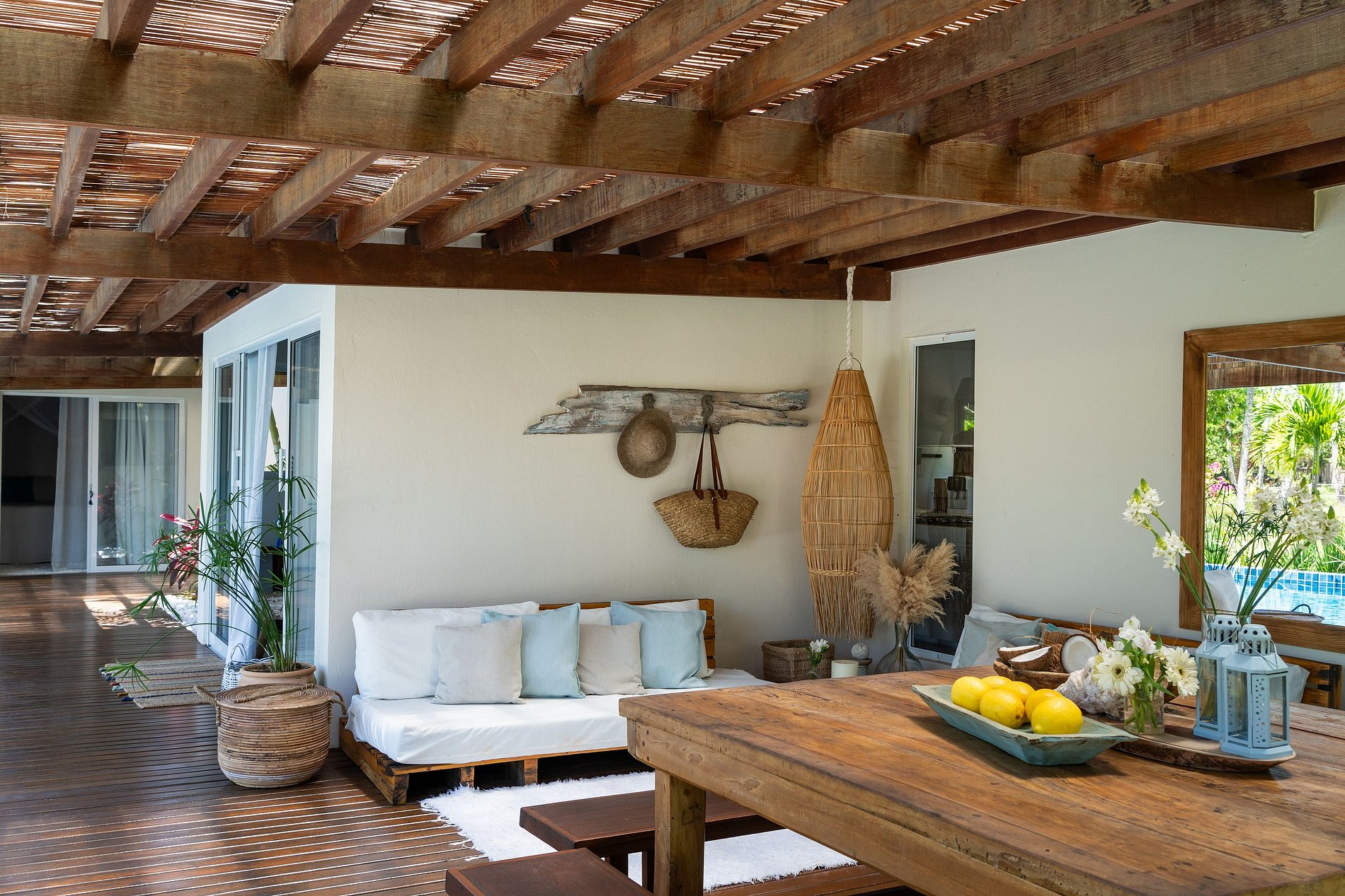 Varanda externa com área de descanso e uma grande mesa de madeira para as refeições ao ar livre.