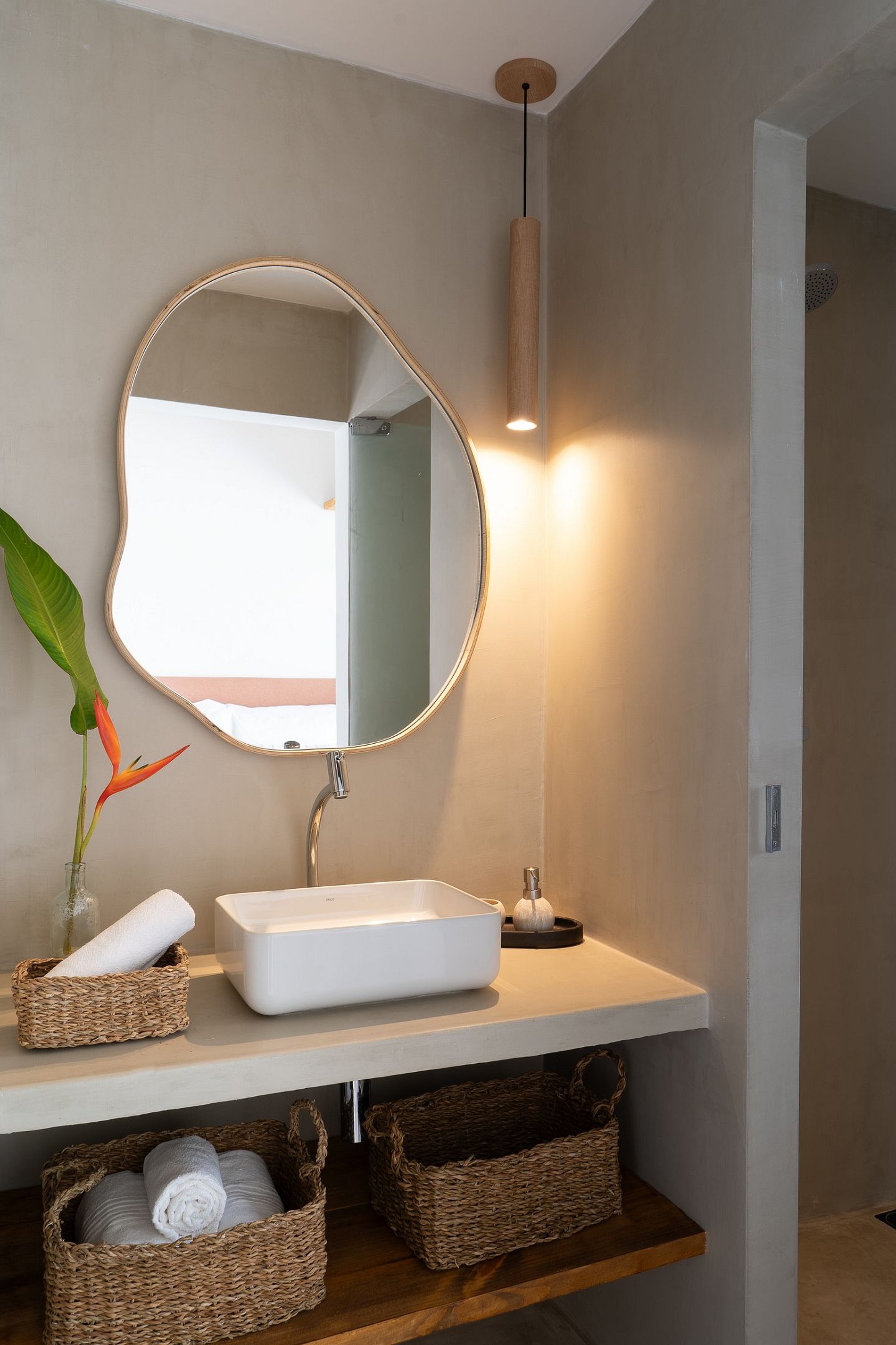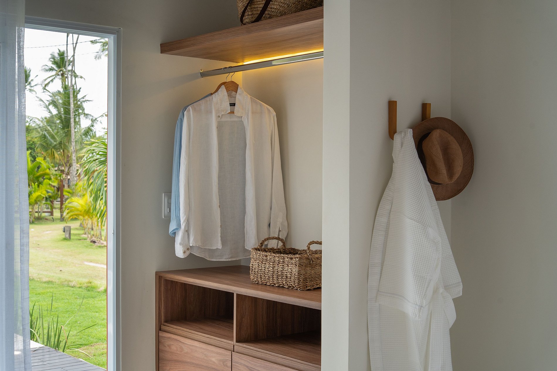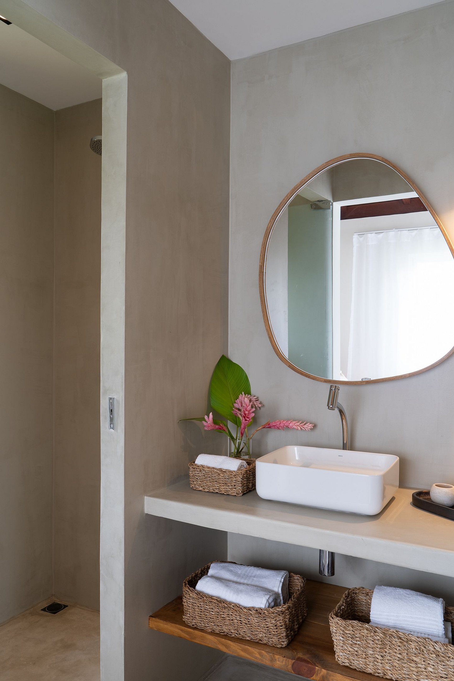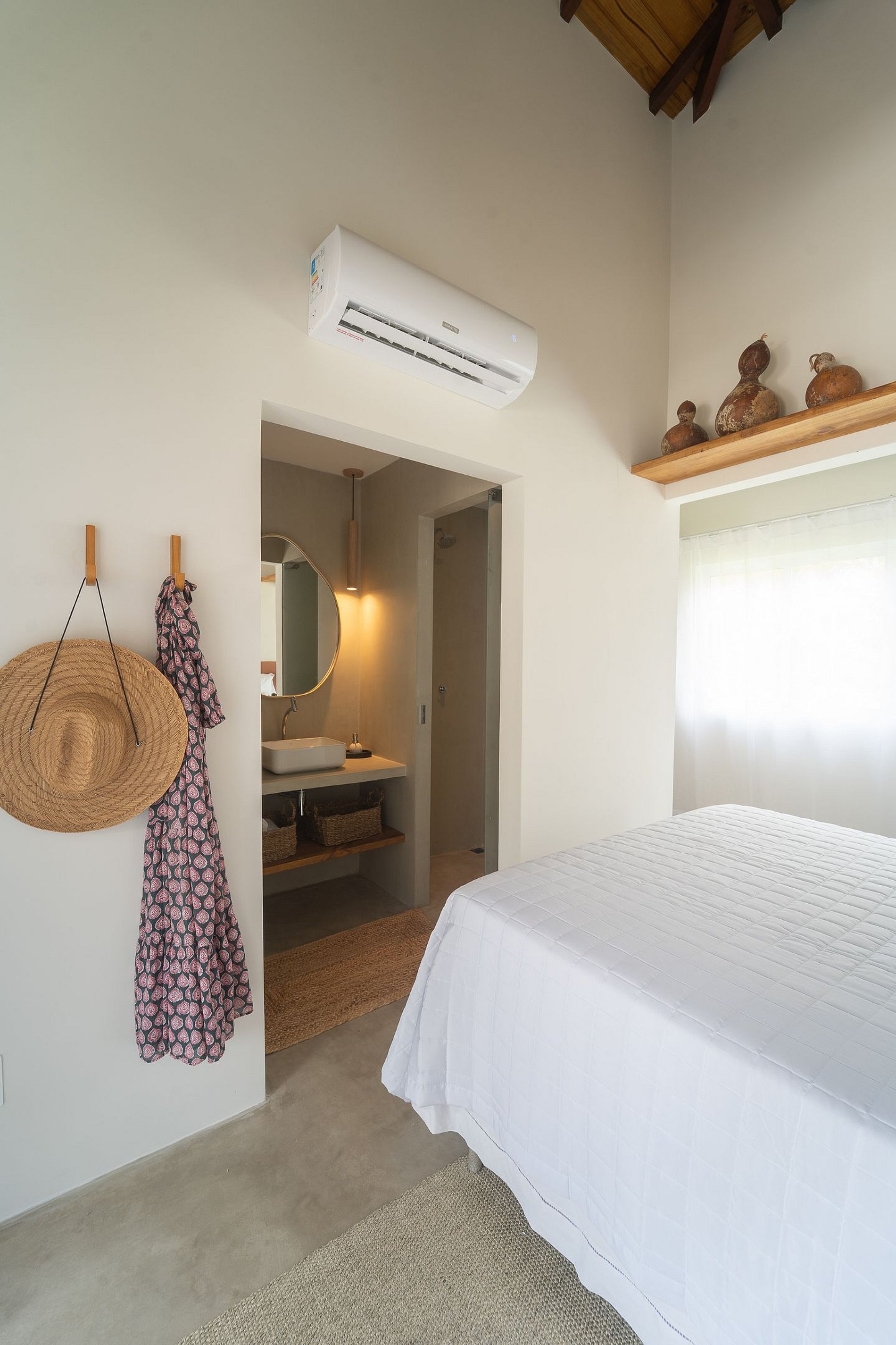 São suítes equipadas com ar-condicionado, redes mosquiteiros, dossel e banheiros modernos.